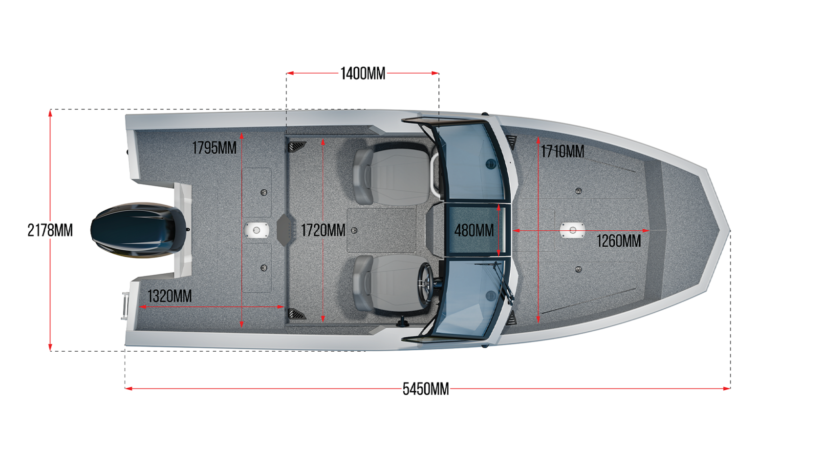 Длина, м; 5.45 Ширина, м; 2.18 Вес, кг; 680 Угол килеватости на транце, град.; 18 Тип двигателя; подвесной Максимальная мощность двигателя, л/с; 140 Топливный бак, л; 120 Высота транца, м; 0.65 Максимальная пассажировместимость, чел; 4 Материал днища; алюминиево-магниевый сплав 5083